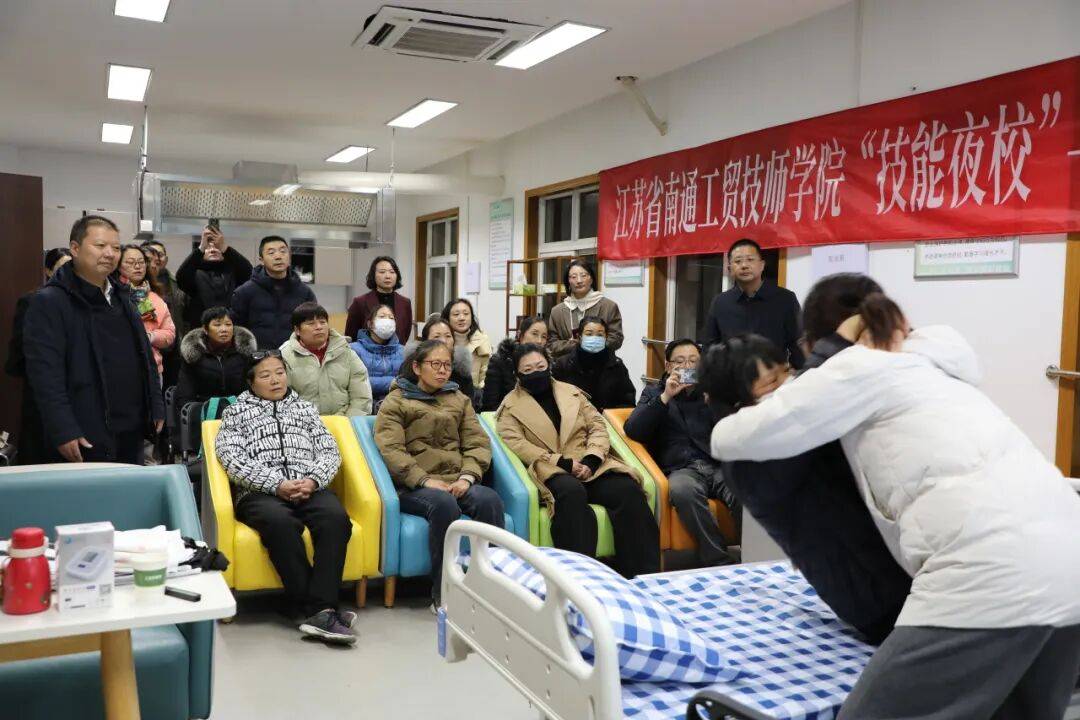 针对这一现状,“技能夜校”本着“补短板、强弱项、提技能”的原则,结合社区老龄化特点、家政服务人员需求大,而从业人员缺少专业理论知识和实操技能培训的短板,依托江苏省南通工贸技师学院优质师资,与“江海好阿姨”家政服务资源共享、优势互补,开设家庭保洁、养老护理、婴幼儿照护、陪诊师、中医理疗师等实用课程,以“工匠课堂+实操训练+案例教学”模式,为市场输送“有技能、有品质、有温度”的家政服务人才,满足老龄化小区对家政服务人员的现实需求。“‘江海好阿姨’家政服务有实训场地、专业讲师、设施设备等技能培训优势,与群众需求贴得比较近,践行‘群众需要什么技能就培训什么技能’宗旨,采取‘理论+实操’的模式,也符合阿姨们这个年龄段学习技能的接受方式。”“江海好阿姨”品牌的创始人康爱勤分享了其开展“技能夜校”培训的初衷和坚守。目前,南通市人社局通过职业技能培训、补贴政策、平台搭建等措施扩大供给,加大培训“一老一小”服务人员力度,建设社区驿站,推动家政服务标准化、规范化发展,致力于“为了一个家庭的美好生活”而付诸实践。