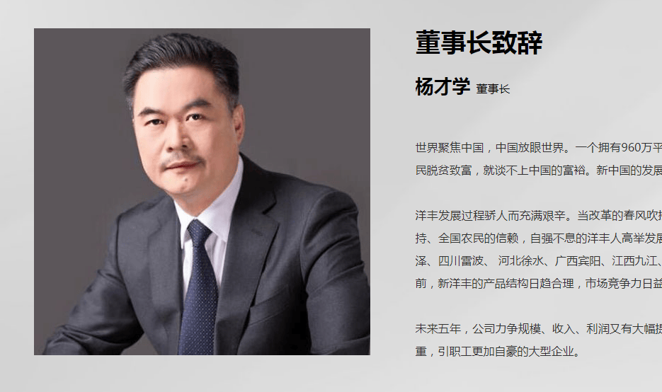 对于洋丰集团掌舵人杨才学,上海证券报2018年10月25日曾以《新洋丰董事长杨才学:行业“天花板”下的“想象家”》为题做过人物报道。报道称,专注化肥领域30年,从一个连年亏损的小化肥厂,到去年净利润近7亿,新洋丰成为国内磷复肥龙头企业。杨才学用“梦幻”来形容这个常人眼中的传统产业,“化肥是一个充满想象力的东西。”“从一个高中毕业就开始销售化肥的业务员,到如今带领6000多人一起做化肥的董事长;从30年前的铁锹拌化肥到如今的国家级高新技术企业,杨才学率领新洋丰,实现了年收入近百亿、净利润近7亿元的优异成绩。”