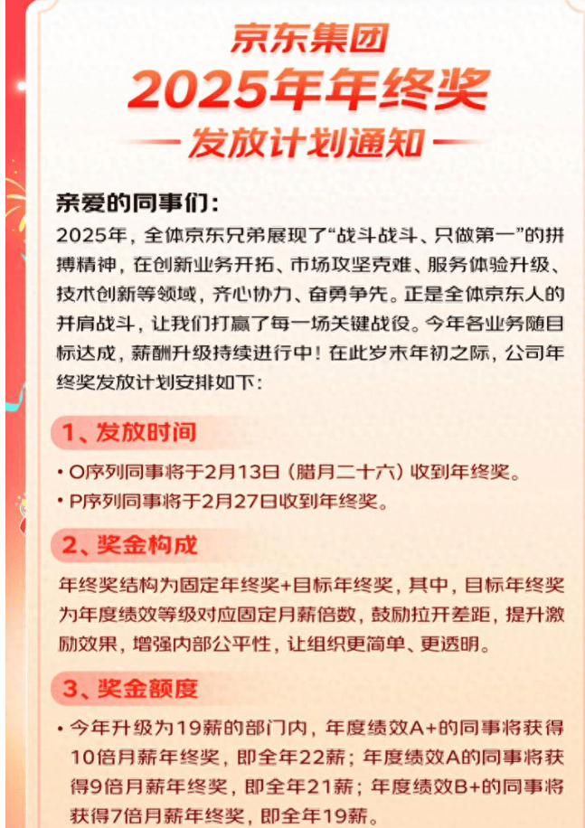 据红星新闻,今年12月25日,有京东员工在社交媒体透露,京东年终连连曝出好消息:在前一天刚给全国各地员工送上10万盒新年惊喜巧克力后,当天又发布了2025年终奖公告——京东全集团92%的员工拿满甚至拿到超额年终奖,年终奖投入同比增幅超过70%,预计将创下行业今年最大涨幅。公告显示,今年薪酬已升级部门如期实现19薪(年终奖为7倍月薪),同时更有业务单元提前实现20薪。此外,一线员工年终奖仍将在年前发放。
